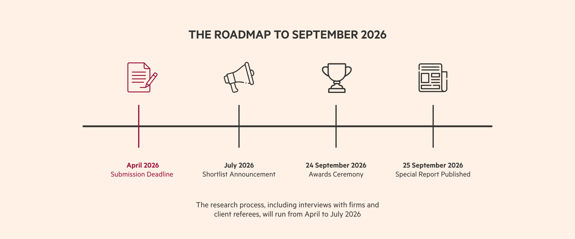 Law firms are invited to make a maximum of eight submissions across seven categories, not including the FT law firm index. Submissions will be assessed by the FT’s research partner, RSGI, using benchmarks, interviews, surveys and other research.